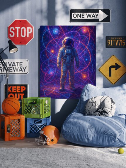 A vibrant and playful room features a striking neon-colored astronaut artwork hanging on a blue wall. Surrounding the poster are