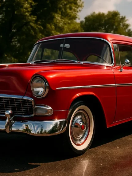 The image depicts a classic red sports car with an elegant, timeless design. The vehicle stands out for its glossy