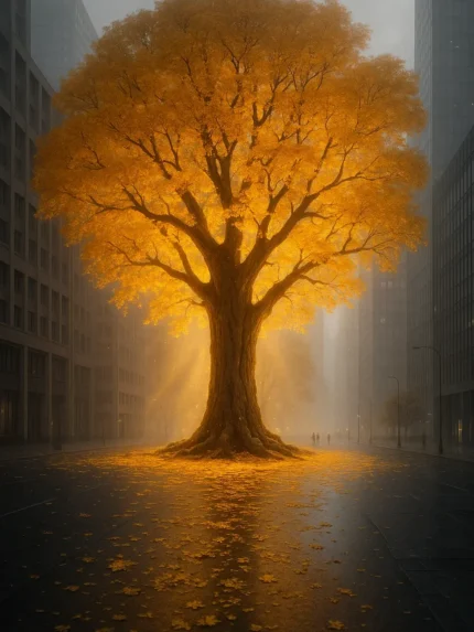 This image depicts a stunning and atmospheric scene set within a modern city. At its center stands a magnificent tree