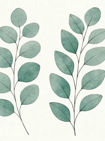 This image features a minimalistic and elegant botanical illustration of two leafy branches. Each branch is composed of soft, rounded