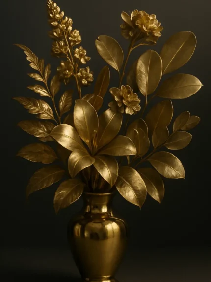 This image presents an exquisitely crafted golden floral arrangement displayed in an elegant, polished vase. The composition features a harmonious