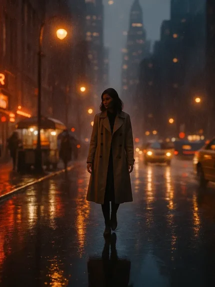 This image shows a rainy city street at night, illuminated by warm streetlights and colorful neon signs. A woman wearing