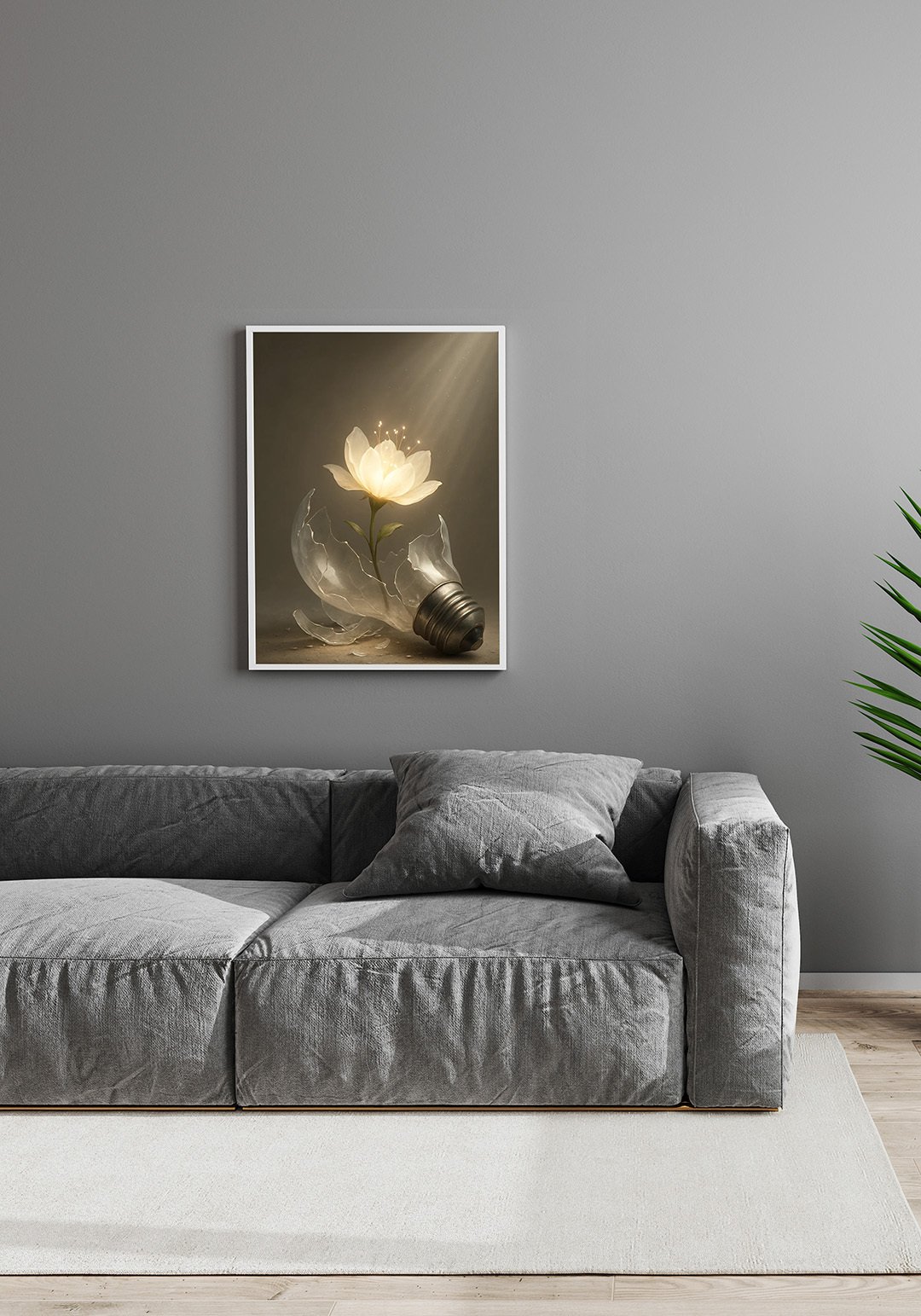 A modern living room features a large gray sofa with soft cushions arranged casually along its length. On the light gray wall above the sofa hangs a framed artwork depicting a glowing white flower emerging from a broken light bulb, illuminated by a gentle ray of light. The artwork adds warmth and elegance to the minimalist space. To the right, a green plant introduces a touch of natural color, balancing the otherwise neutral tones of the room. The overall atmosphere is calm, stylish, and contemporary.