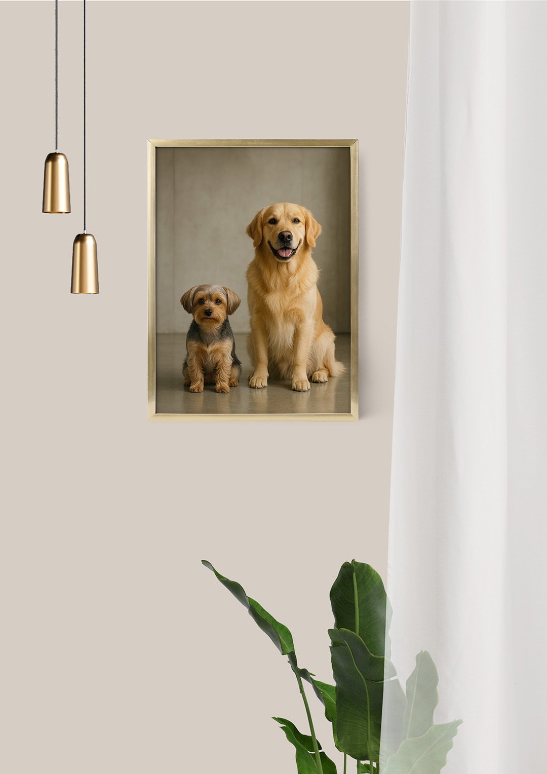 A warm and elegant interior setting features a framed photograph of two adorable dogs—a small brown-and-gray pup and a happy golden retriever—displayed on a soft beige wall. The frame has a subtle golden tone that complements the room’s sophisticated décor. To the left, two modern gold pendant lights hang gracefully, adding a touch of luxury. On the right, a white curtain flows gently, softening the space, while a green leafy plant below introduces a fresh natural element. The overall scene feels cozy, stylish, and inviting.