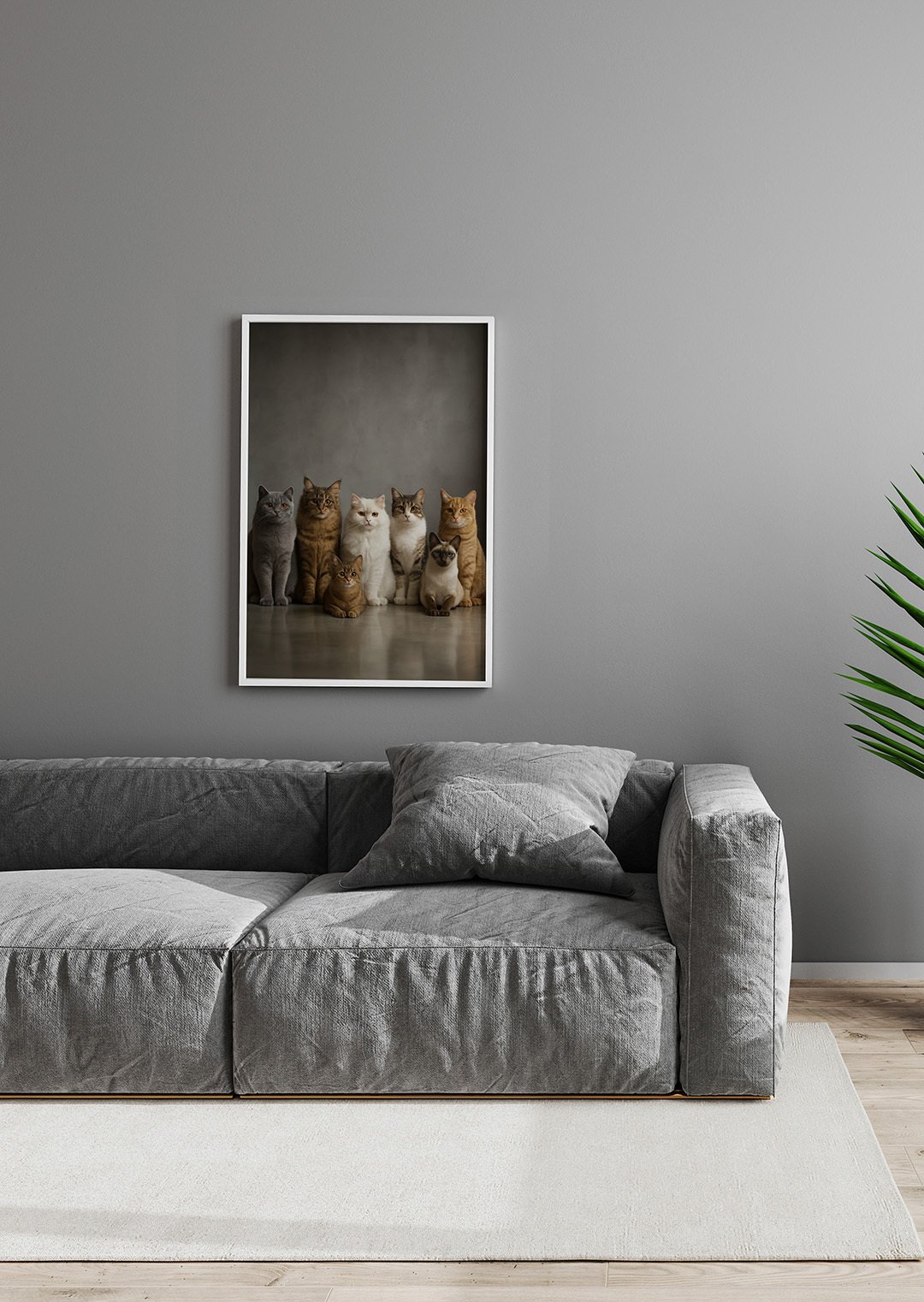 This image depicts a calm, modern interior with a soft, minimalist style. On the wall hangs a framed artwork showing a row of cats sitting side by side against a neutral background, creating a gentle and charming focal point. The cats’ different colors and fur patterns add warmth and personality to the space.