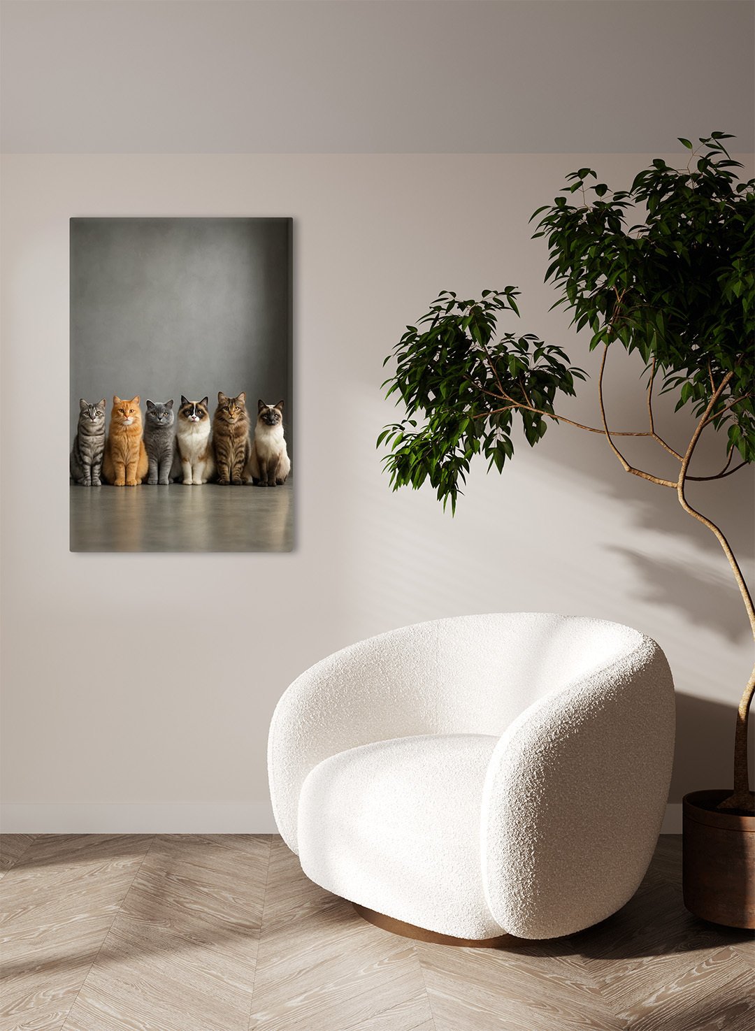 This image presents a serene and contemporary interior with a minimalist aesthetic. Mounted on the wall is a framed artwork featuring a row of seven cats sitting side by side, each with a unique coat color and pattern. The soft, neutral background of the artwork complements the calm atmosphere of the room.