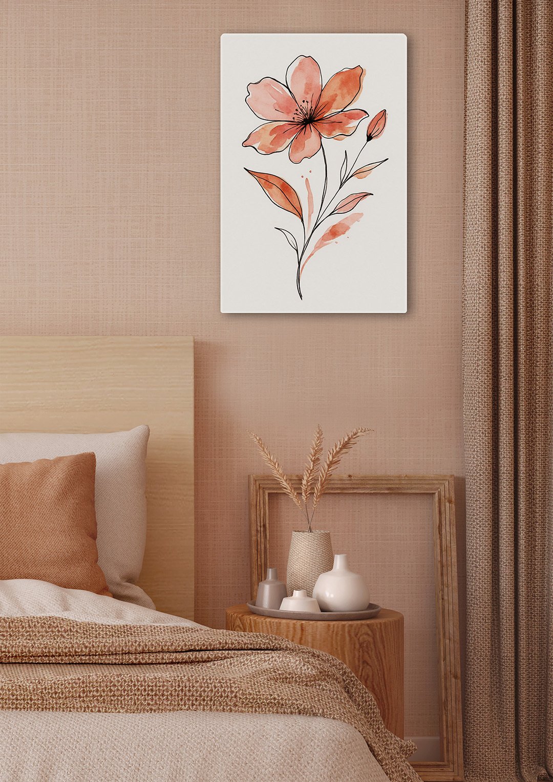 A warm and cozy bedroom is decorated in soft earthy tones, creating a calm and inviting atmosphere. Above the wooden bedside table hangs a delicate watercolor line art painting of a peach-colored flower, adding a gentle touch of nature to the space. The table holds minimalist ceramic vases and dried grasses, enhancing the natural, organic aesthetic. The bed is dressed in textured blankets and neutral pillows, blending beautifully with the surrounding warm beige and taupe hues. The overall scene feels serene, stylish, and perfectly balanced.