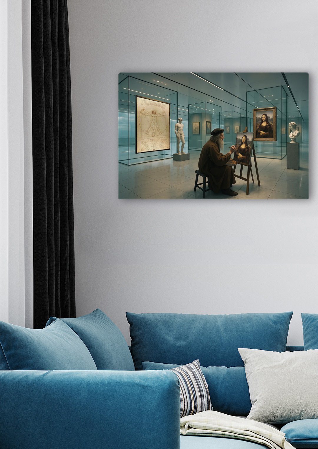 A modern living room features a plush blue sofa adorned with soft pillows in neutral and striped patterns, creating a cozy and inviting seating area. Above the sofa hangs a captivating artwork depicting a surreal museum scene where a man dressed like Leonardo da Vinci paints the Mona Lisa inside a contemporary glass gallery. The cool blue and teal tones of the artwork blend harmoniously with the room’s color palette, adding sophistication and artistic character to the space. The overall ambiance feels stylish, calm, and thoughtfully curated.