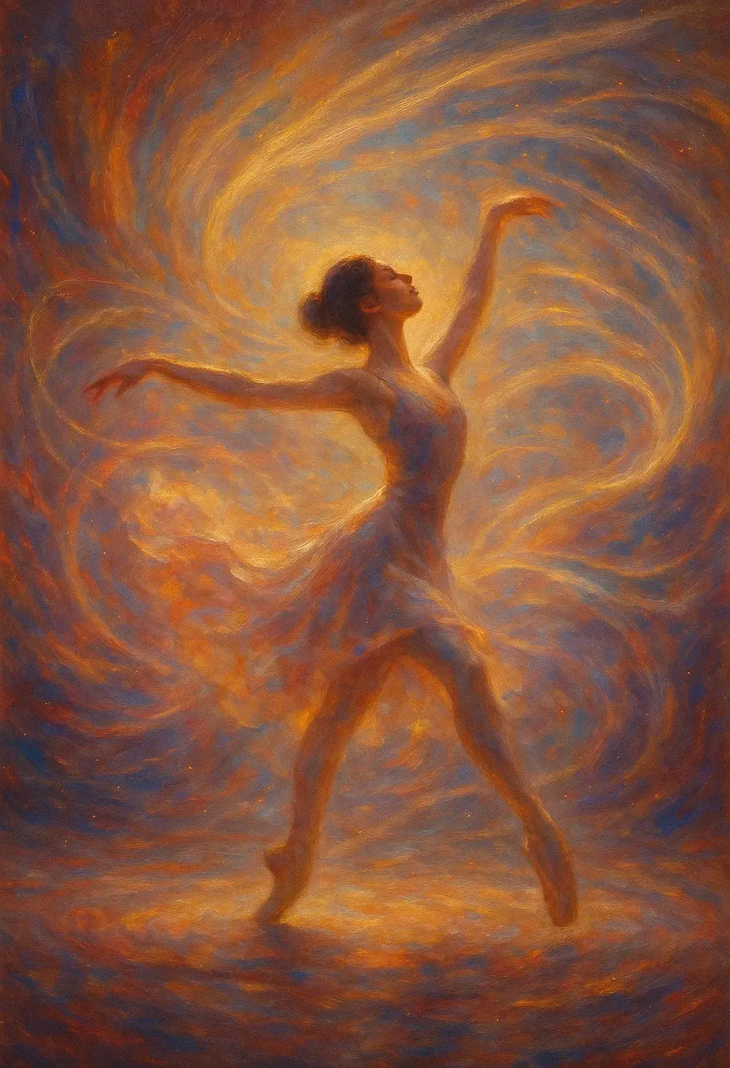 nd purple light, creating a sense of movement and ethereal energy. The warm, glowing tones of the painting contrast beautifully with the pastel pink background, adding depth and artistic flair to the space. The combination of delicate décor and dynamic artwork creates a cozy yet sophisticated atmosphere, blending grace, warmth, and creativity.
