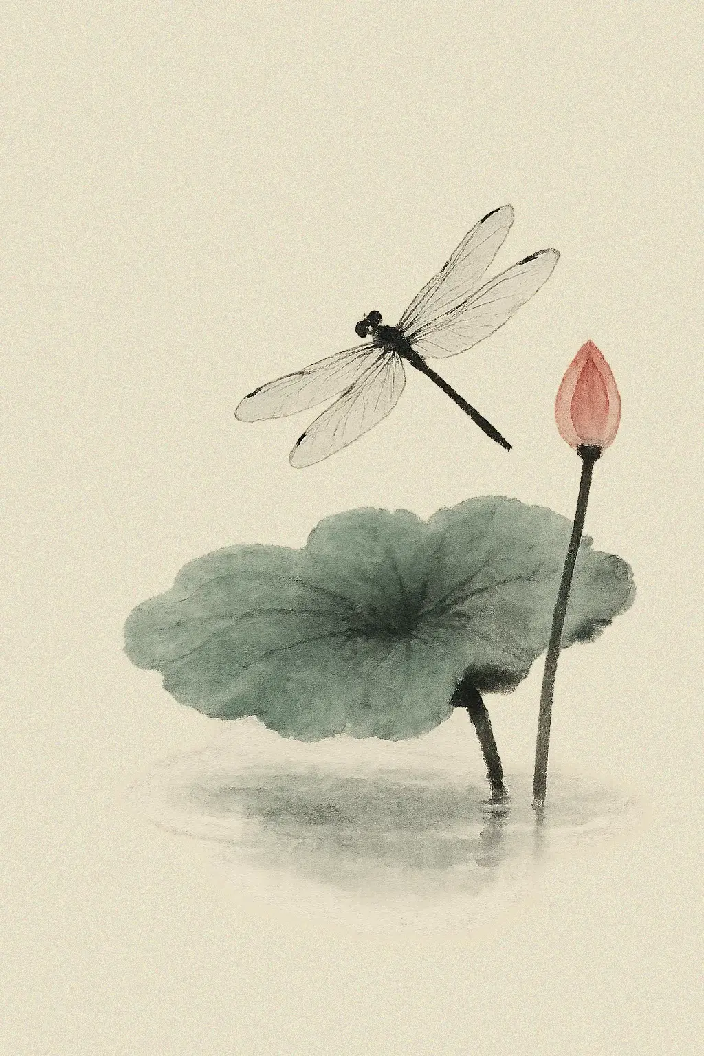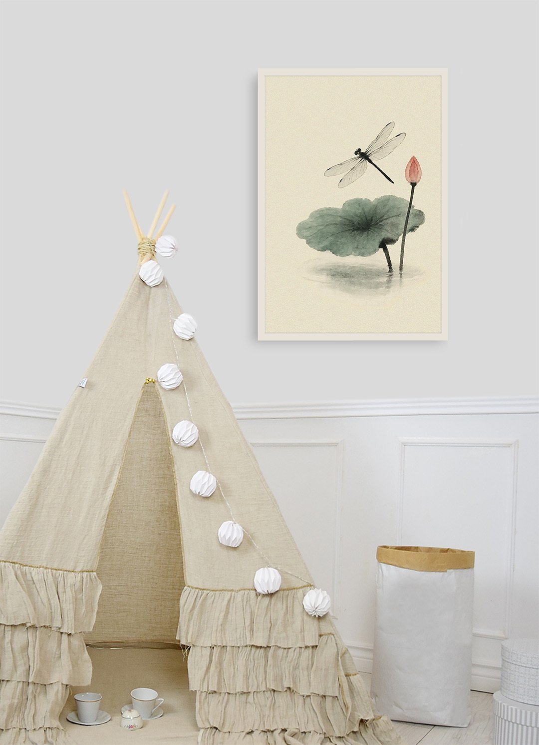 To the right, a white paper storage bag adds a clean, minimalist accent. Above the setup, a framed poster featuring a dragonfly and lotus artwork brings a sense of calm and natural harmony to the room. Overall, the space feels warm, simple, and serene—perfect for a child’s peaceful environment.