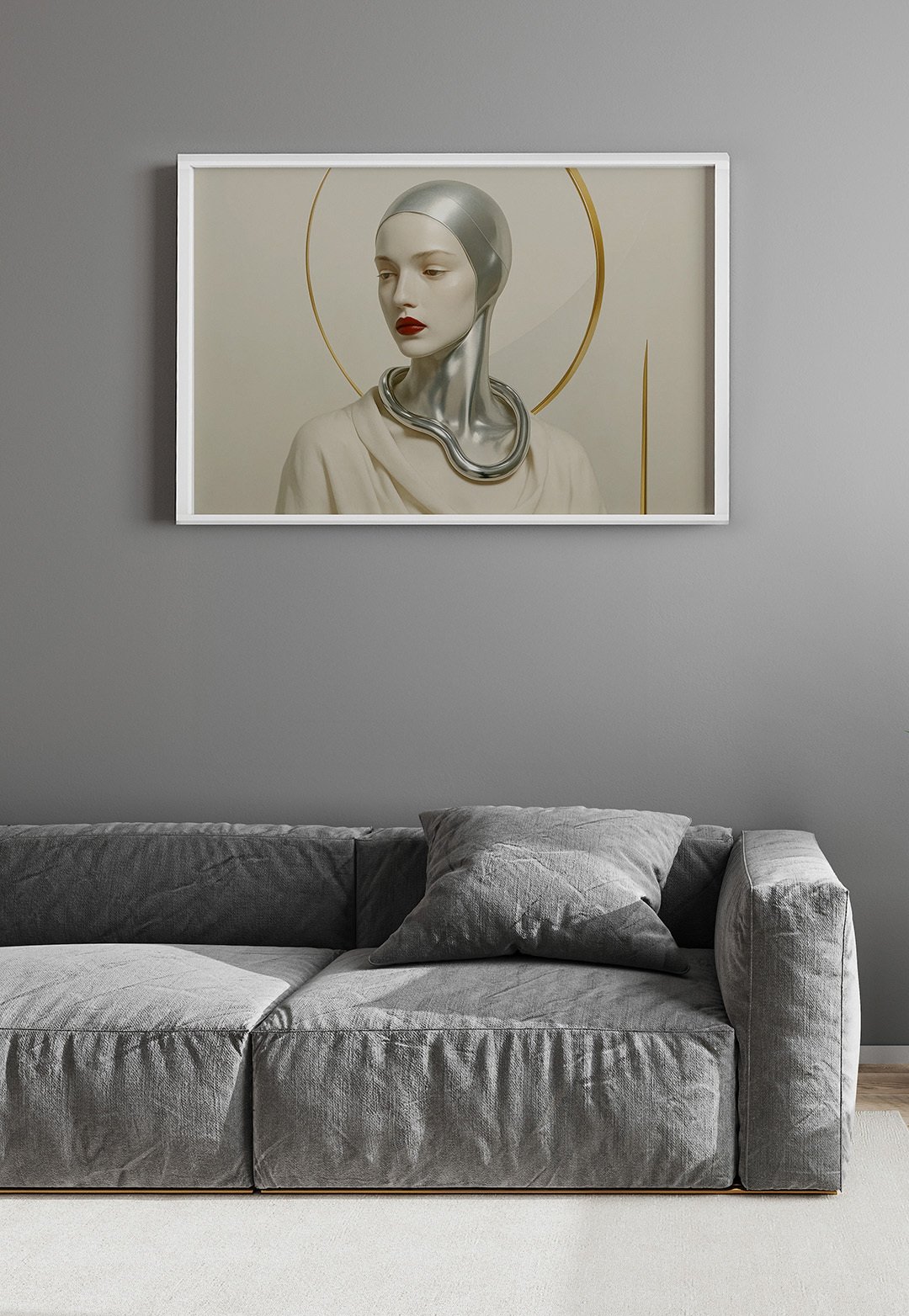 This image depicts a contemporary living room styled with clean lines and understated elegance. A plush gray sofa stretches across the lower portion of the scene, its soft cushions adding comfort to the minimal aesthetic. Above it, a framed artwork becomes the focal point: a refined, futuristic portrait featuring a figure with a sleek silver headpiece and elongated metallic neck. The subject’s red lips and serene expression create a striking contrast against the soft neutral tones of the clothing and background.