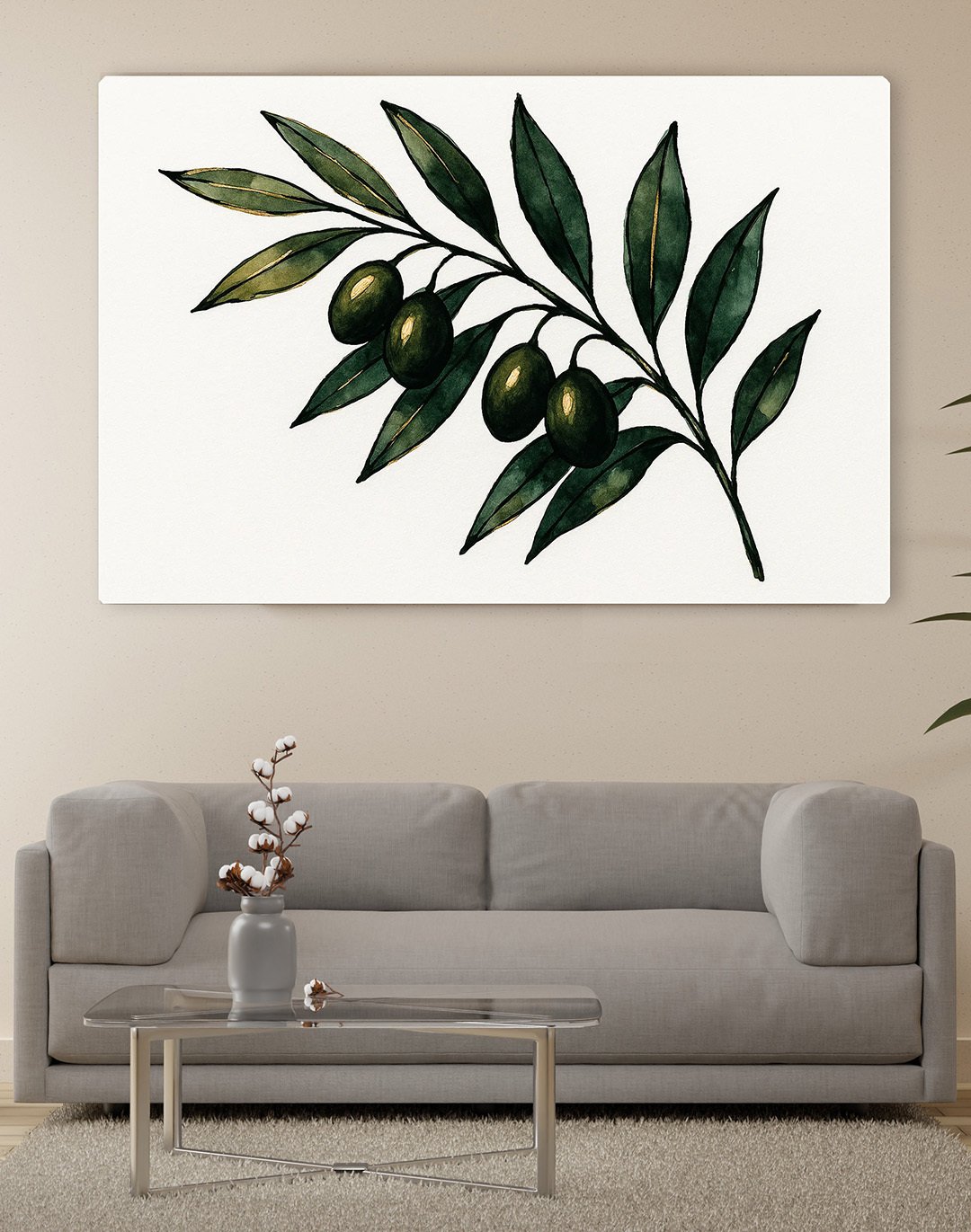 This image showcases a modern, minimalistic living room featuring a large wall artwork of an olive branch. The illustration displays deep green olives and elongated leaves with rich shading, creating a natural and elegant focal point against the light background.