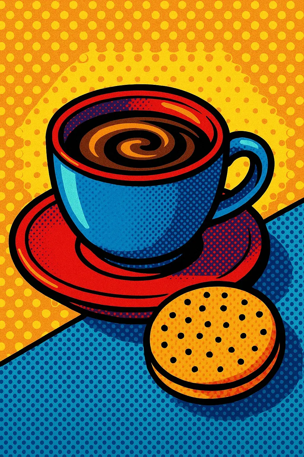 A framed pop art artwork displayed in a modern interior setting. The illustration features a blue coffee cup with a swirling hot drink on a red saucer, accompanied by a round biscuit. The vibrant yellow halftone background and bold outlines create a lively, retro aesthetic. The artwork is leaning against a dark green wall on a light wooden floor, next to a yellow cushion and a leafy plant, blending contemporary decor with colorful graphic art.