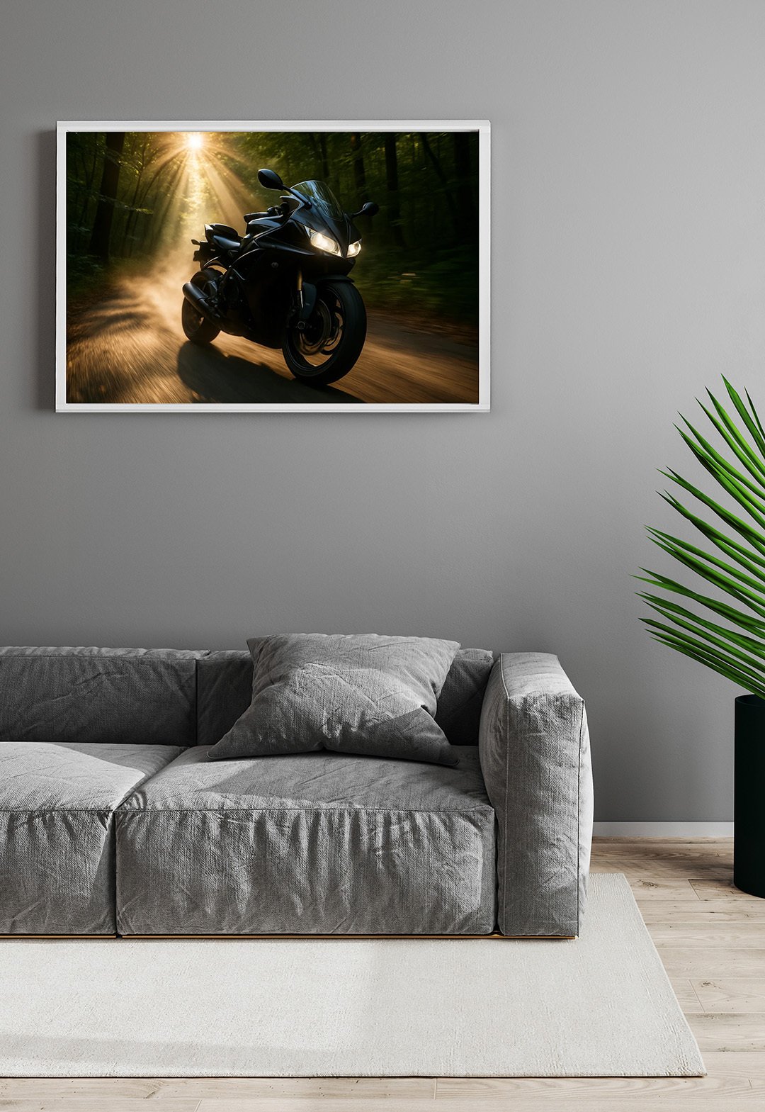 This image presents a modern living room with a sleek and minimalist design. The focal point is a framed artwork mounted on the wall, depicting a powerful sport motorcycle riding through a forest road, illuminated by dramatic rays of sunlight. The sense of speed and motion in the artwork contrasts beautifully with the calm interior.