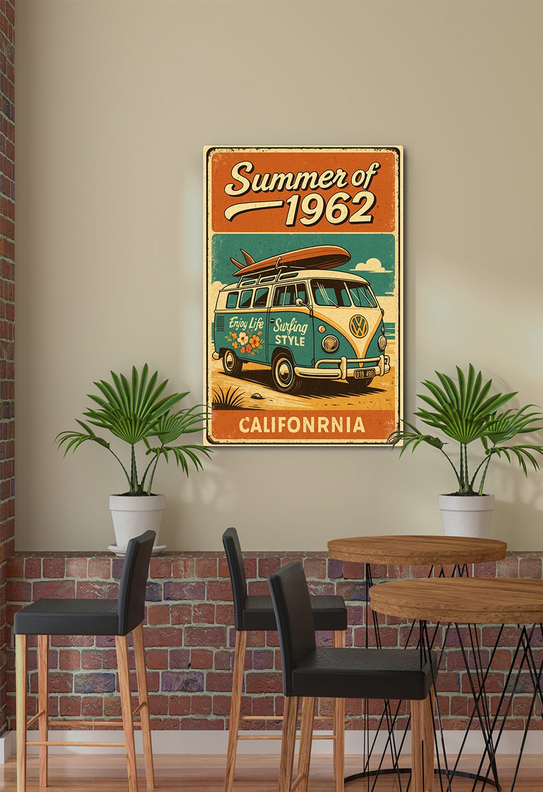 This image presents a retro-inspired poster displayed on a café wall, featuring a vintage illustration titled “Summer of 1962.” The artwork depicts a classic Volkswagen camper van with a surfboard on top, evoking the carefree spirit of California surf culture. Warm, sun-washed colors and a slightly weathered texture enhance the nostalgic aesthetic. The poster is framed and centered against a light wall, complemented by brick detailing, wooden tables, black chairs, and potted green plants, creating a relaxed, stylish interior that blends mid-century charm with a modern café atmosphere.