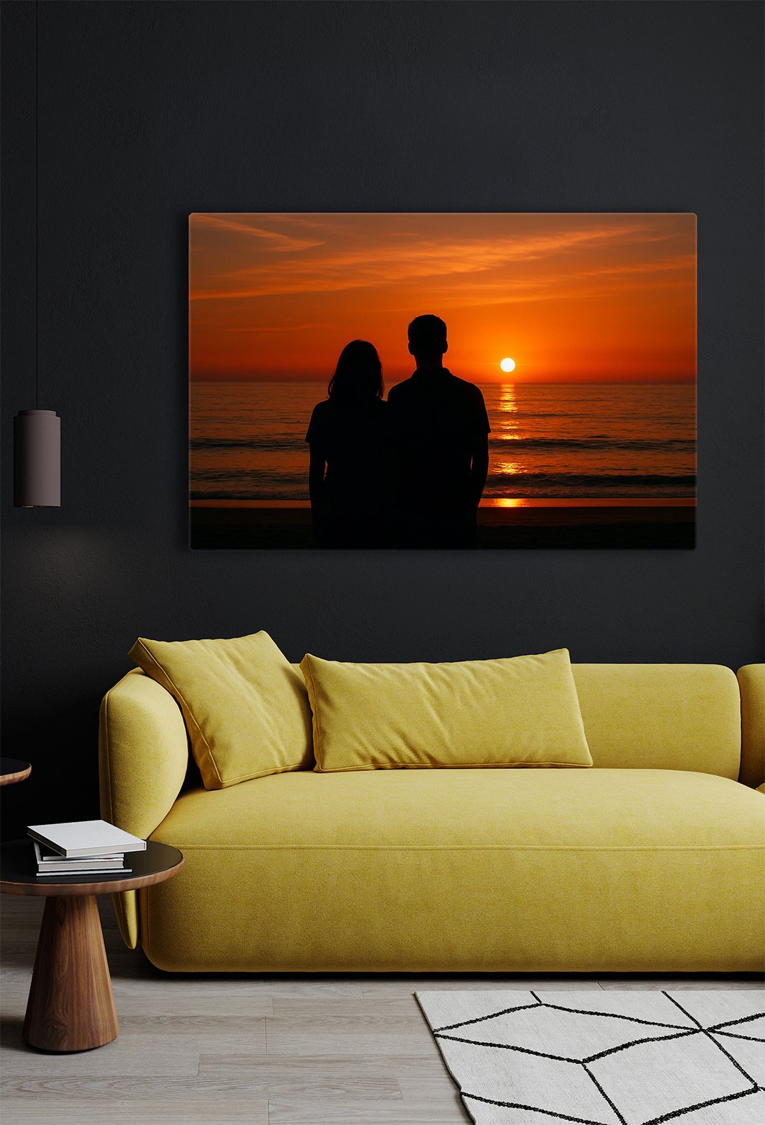 This image presents a modern interior featuring a framed photograph of a couple silhouetted against a vivid ocean sunset. The warm orange tones of the sunset contrast beautifully with the dark wall, drawing attention to the artwork as the focal point of the room. Below it, a mustard-yellow sofa adds warmth and contemporary style, while a small side table and minimalist décor complete the space. The combination of rich colors and clean lines creates a cozy yet refined atmosphere, where the artwork enhances the sense of romance and calm within the interior.