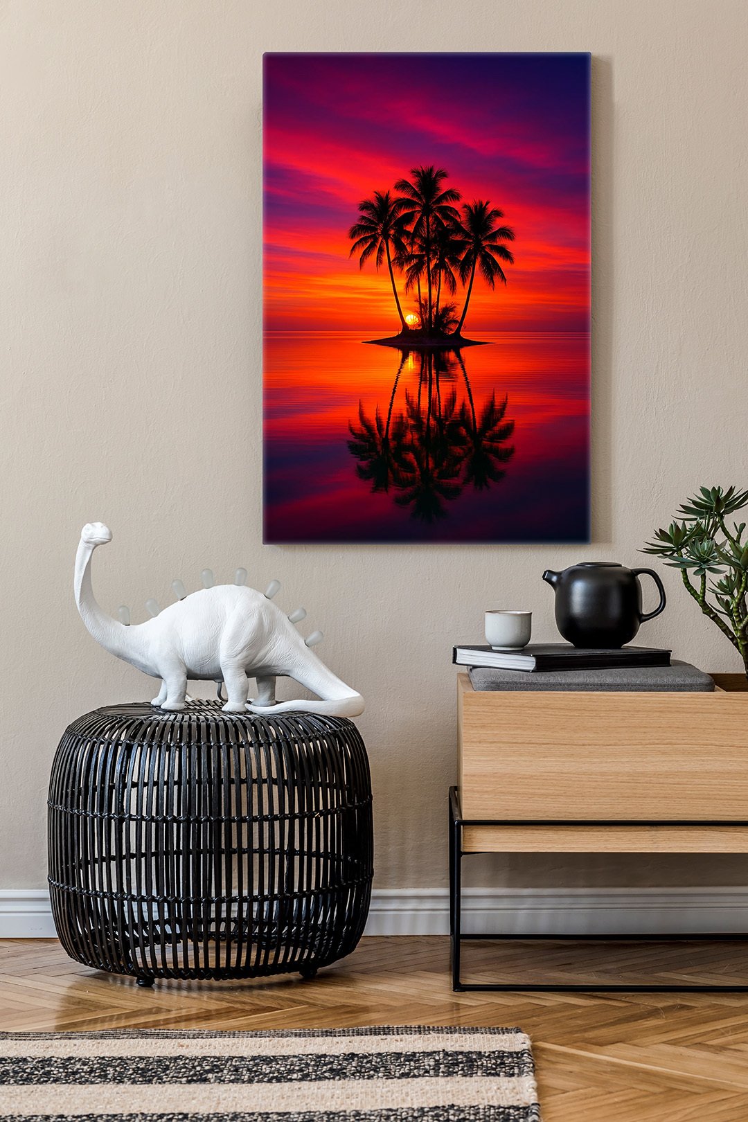 A modern interior featuring a vibrant wall artwork of a tropical island at sunset. The artwork shows silhouetted palm trees reflected in calm water beneath a dramatic sky filled with red, orange, and purple tones. Below the artwork, a minimalist wooden sideboard and a woven black stool are styled with decorative objects, including a white dinosaur sculpture and a small plant. The bold colors of the artwork create a striking focal point within the calm, contemporary space.