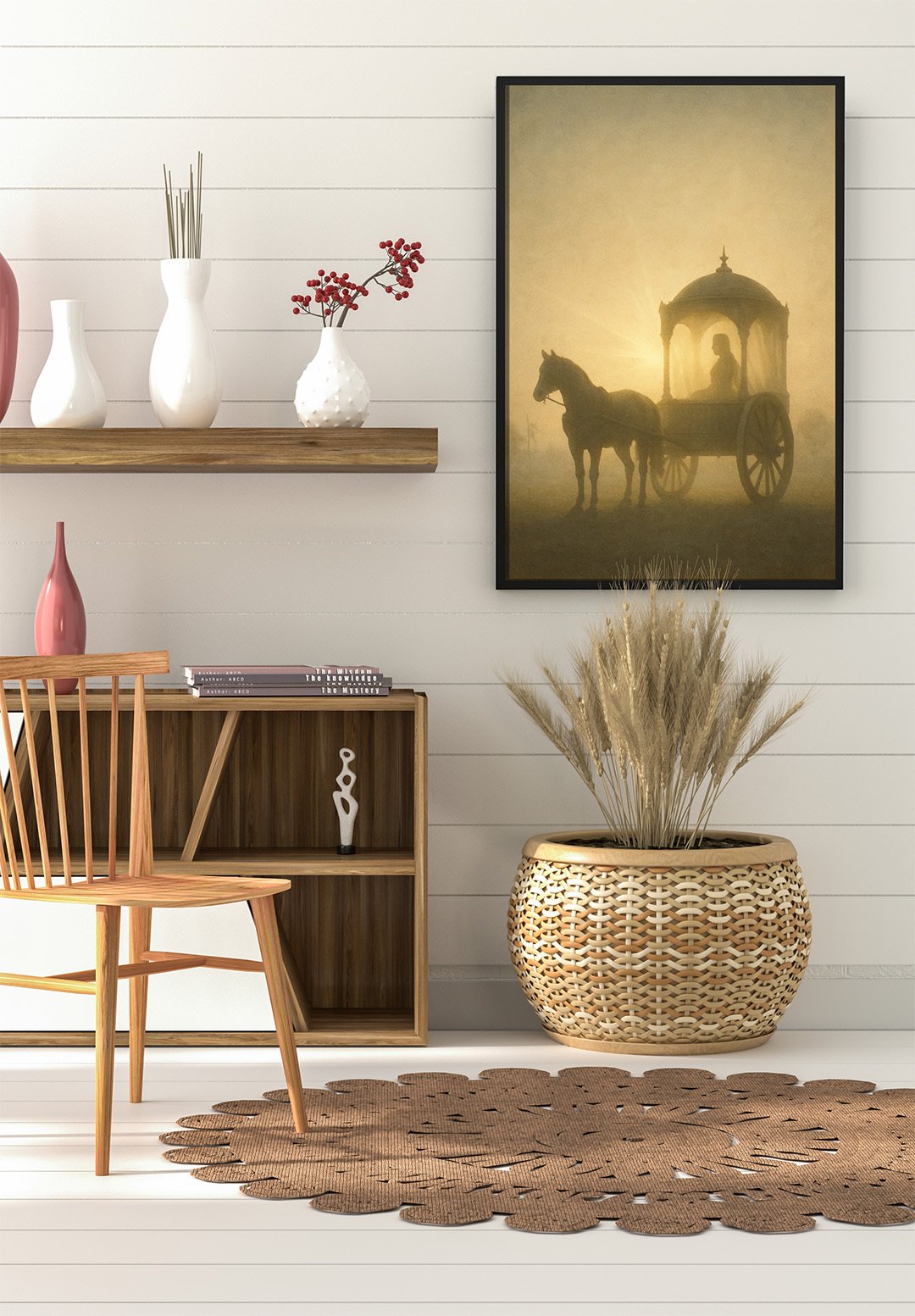 A cozy, thoughtfully styled interior with a framed wall artwork depicting a horse-drawn carriage surrounded by soft golden fog. The nostalgic scene adds warmth and a timeless atmosphere to the space. The artwork is complemented by natural textures and neutral tones, including a wooden chair, a low sideboard with decorative vases, a woven basket filled with dried plants, and a textured rug, creating a harmonious and elegant living area.