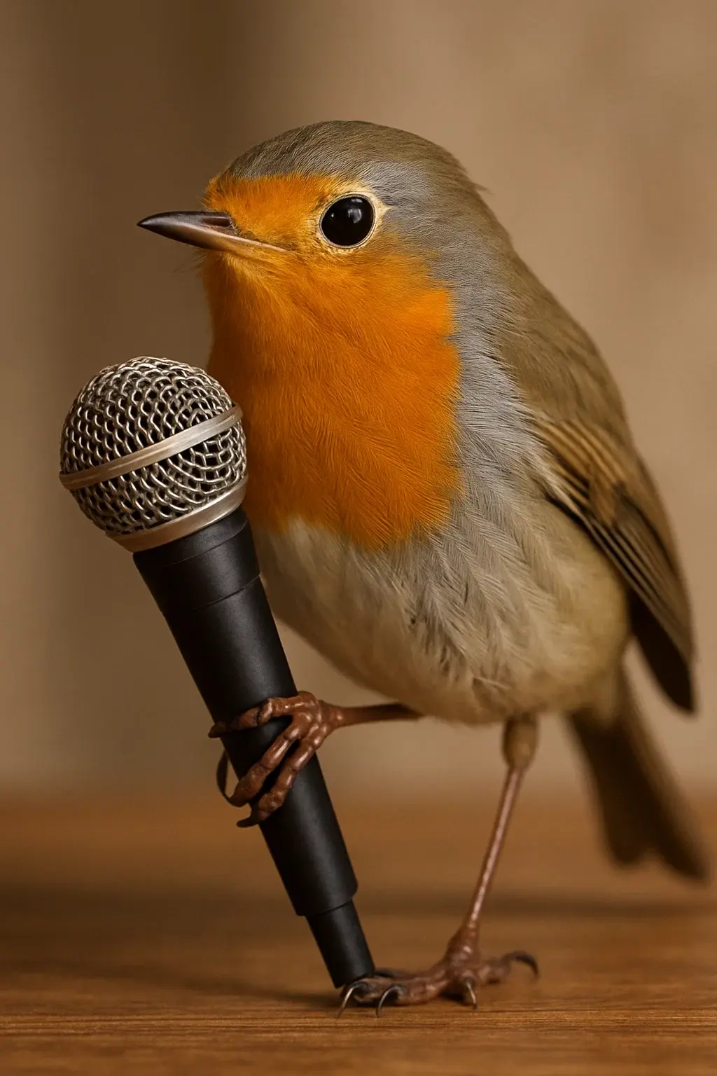 This image shows a small robin standing on a wooden surface while holding a microphone. The bird’s bright orange chest contrasts beautifully with its soft brown and gray feathers. The microphone, gripped delicately by the bird’s foot, creates a playful and imaginative scene, as if the robin is about to sing or speak. The warm lighting and shallow depth of field give the image a charming, whimsical atmosphere, blending realism with a touch of humor and creativity.