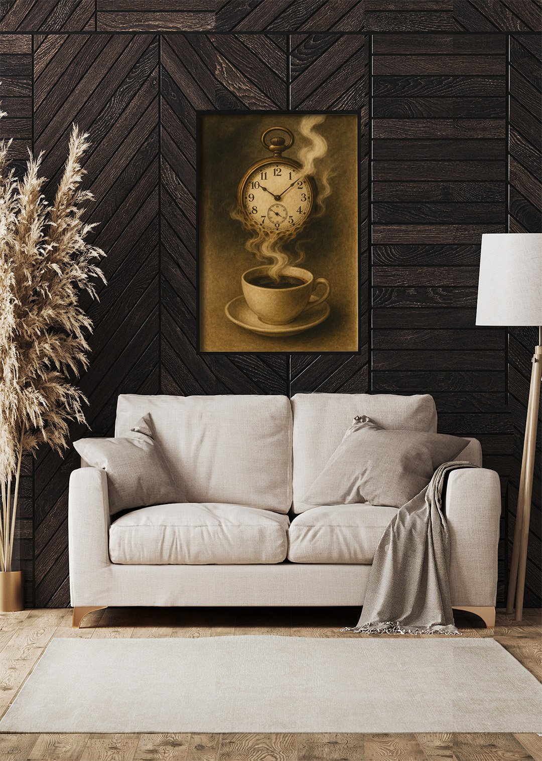 The image depicts a warm, inviting living room with a refined, artistic character. A soft beige sofa sits centered against a dark, textured wooden wall arranged in a herringbone pattern. Above the sofa, a framed artwork features a surreal illustration of a steaming coffee cup transforming into a floating vintage pocket watch, rendered in muted sepia tones. To the left, tall dried pampas grass adds natural texture, while a neutral throw blanket drapes gently over the sofa. A light area rug anchors the space, and a minimalist floor lamp on the right completes the balanced, elegant composition.