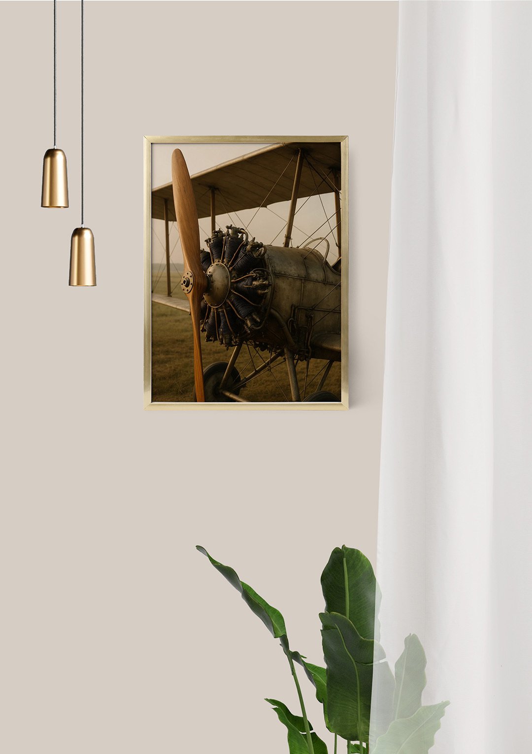 This image depicts a calm and elegantly styled interior with a warm, understated character. The focal point is a framed photograph on the wall showing a vintage propeller aircraft, captured in soft, earthy tones that highlight its exposed engine and wooden propeller. The artwork evokes a sense of history, craftsmanship, and the pioneering spirit of early aviation.