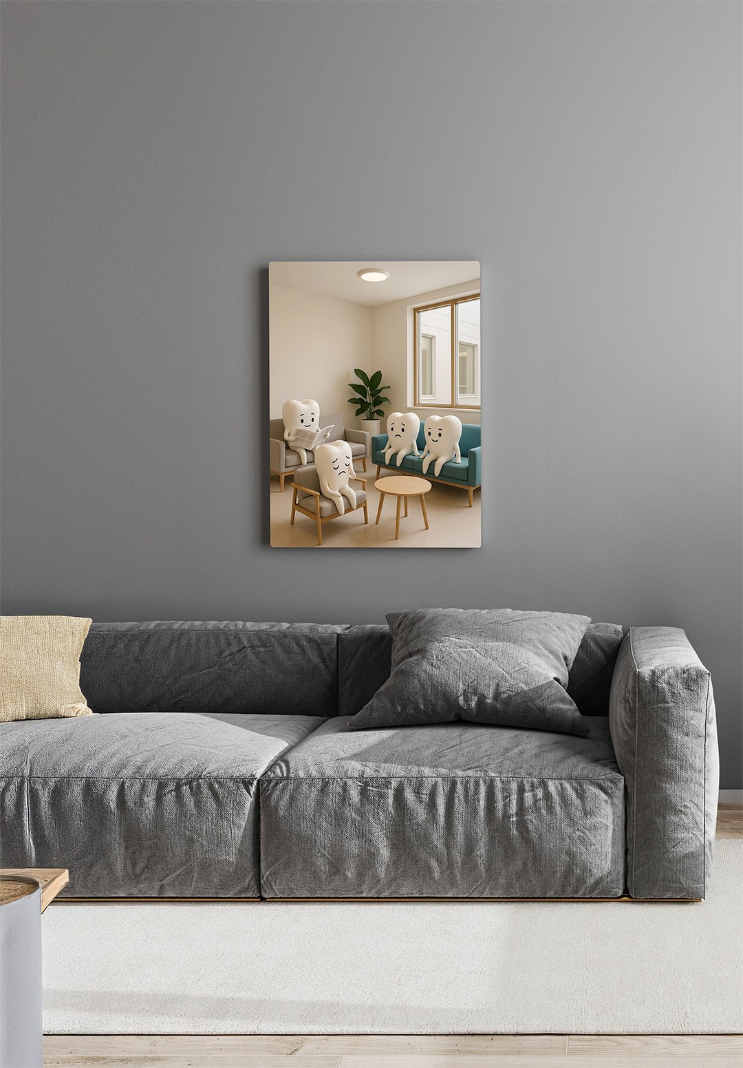 This image shows a modern living room with a clean, minimalist aesthetic. Above a comfortable gray sofa hangs a framed artwork depicting a bright waiting room filled with anthropomorphic tooth characters seated on chairs and sofas. Their varied facial expressions add humor and warmth to the artwork, giving it a playful and friendly tone.