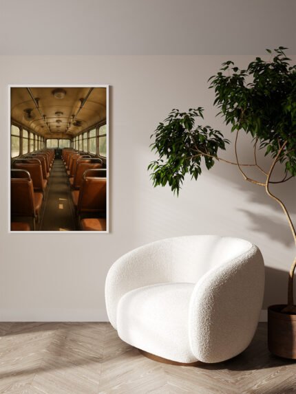 This image presents a serene and well-balanced interior scene. A framed photograph depicting the interior of a vintage bus, with
