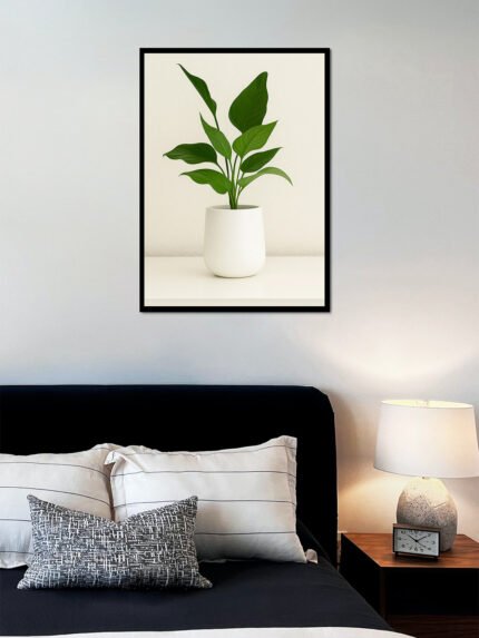 This image features a bright and neatly arranged interior with a fresh, modern aesthetic. A framed artwork displaying a simple