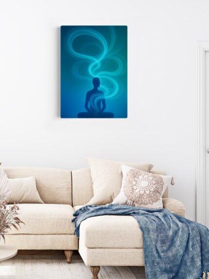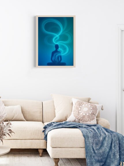 This image presents a calm, thoughtfully styled interior featuring a framed abstract artwork of a meditative human figure. The artwork,
