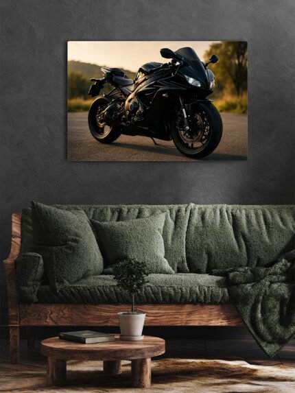 This image shows a modern, dark-toned living room featuring a framed photograph of a black sport motorcycle mounted on the