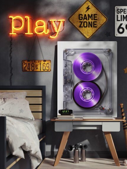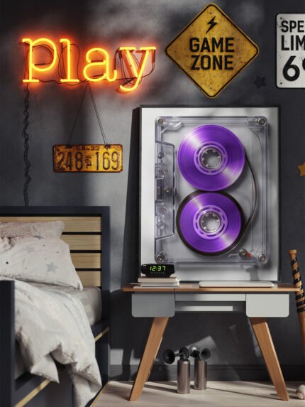 The image depicts a modern, youth-inspired bedroom with playful and retro decorative elements. On the wall, a striking artwork showcases