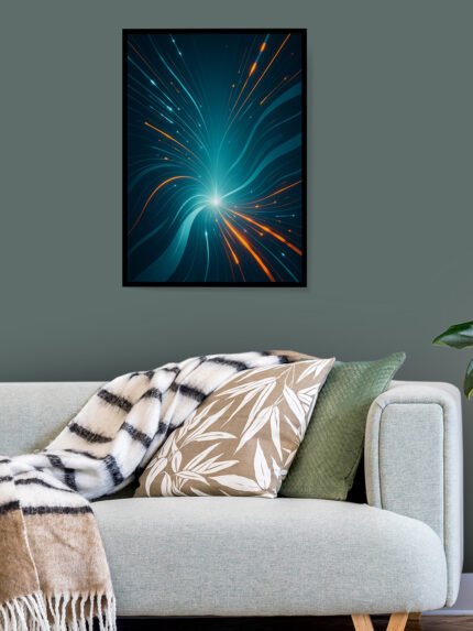 The image shows a modern living room with a stylish and calming aesthetic. A vibrant abstract artwork hangs on the