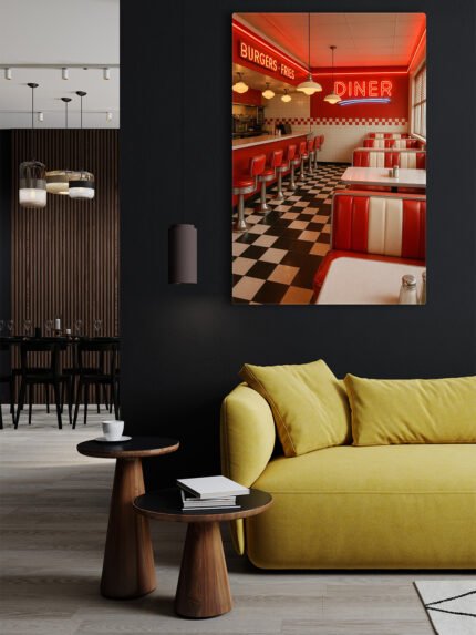 The image shows the interior of a classic American diner with a strong retro aesthetic. Red leather booths, round counter