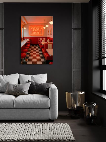 The image depicts a modern living room with dark, elegant tones. A framed artwork of a glowing red retro jukebox