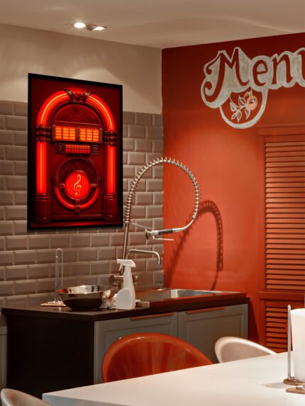 This image depicts a modern kitchen interior accented by a framed artwork of a glowing red vintage jukebox. The illuminated